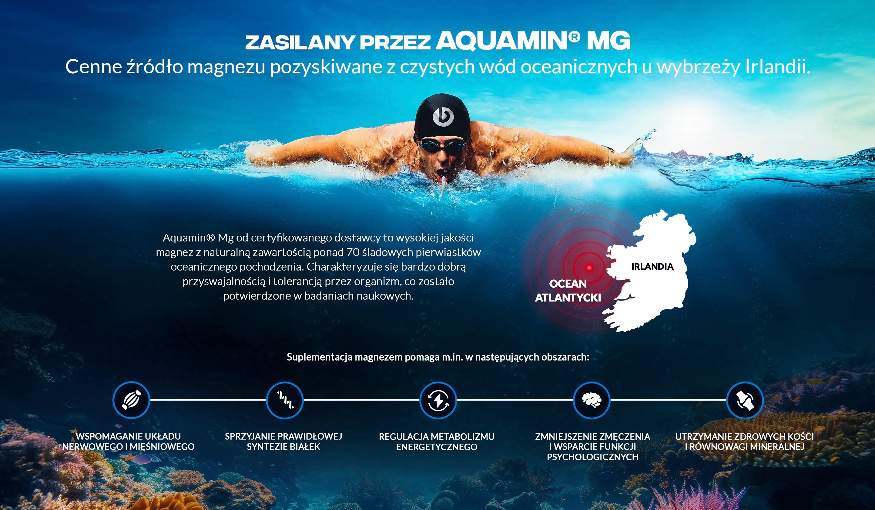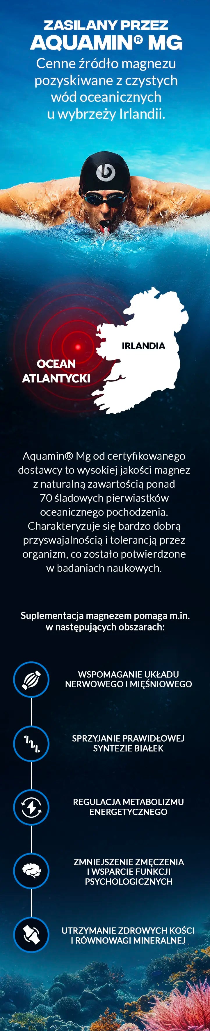 2 - Dzięki zwiększeniu dostępności ATP w komórkach mięśniowych oraz możliwemu wspieraniu syntezy glikogenu, kreatyna (Creapure®) wykazuje działanie ergogeniczne, poprawiając wydolność organizmu podczas krótkotrwałego, intensywnego wysiłku; magnez (Aquamin® Mg) wspiera prawidłową pracę mięśni