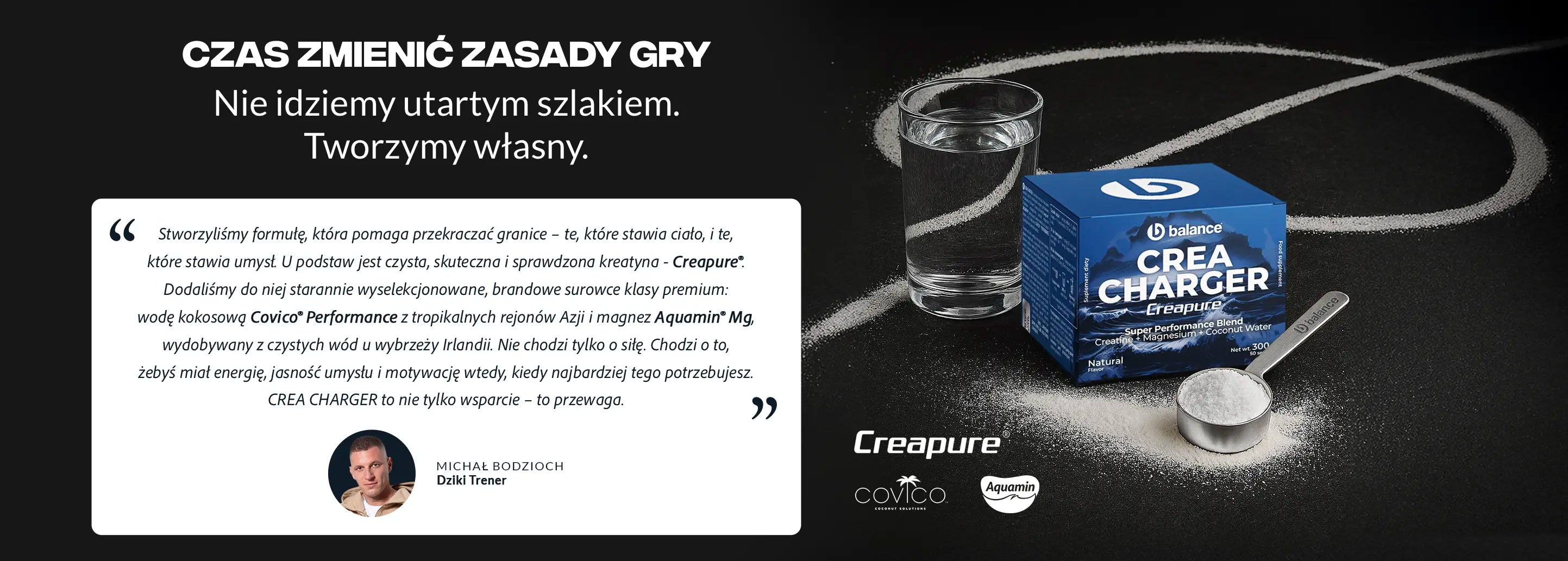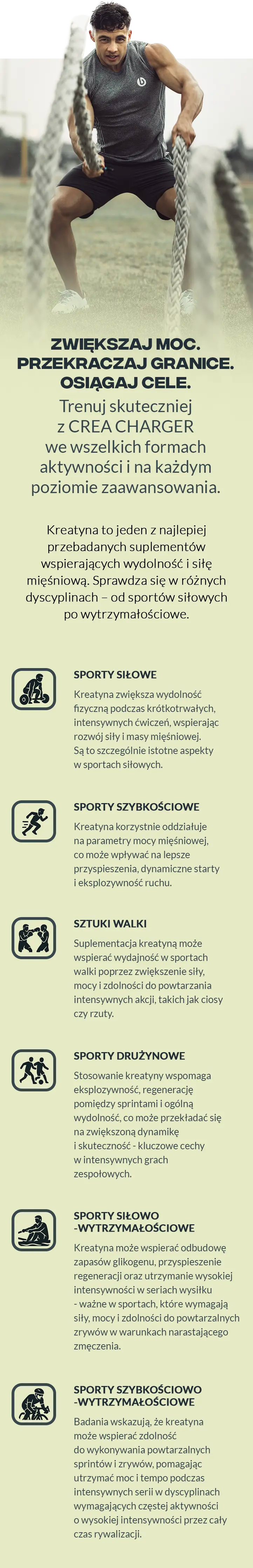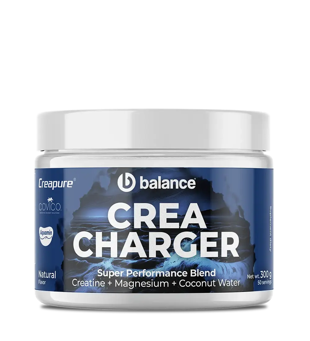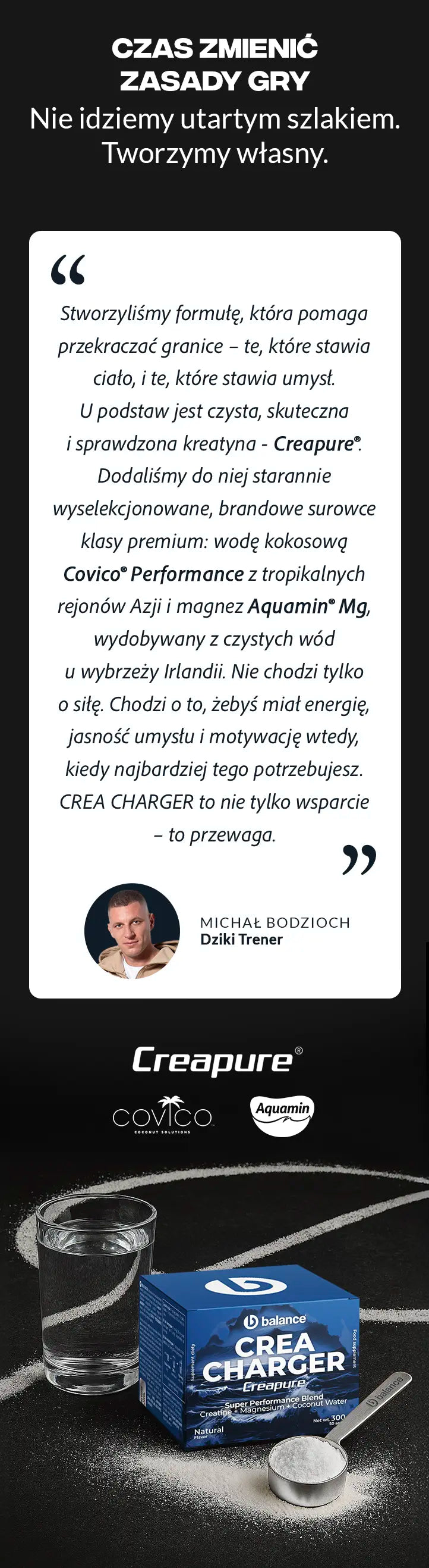 CREA CHARGER to autorska receptura, która zawiera wysokiej czystości monohydrat kreatyny, produkowany w laboratorium Alzchem Group pod marka Creapure®. Dodatkowo wzbogaciliśmy produkt magnezem AQUAMIN® pochodzącym z wody morskiej oraz sproszkowaną wodą kokosową COVICO® PERFORMANCE o podwyższonej zawartości potasu.