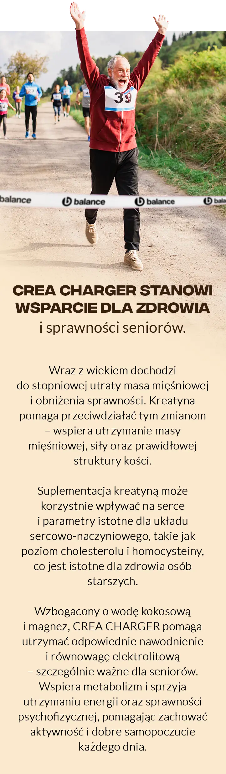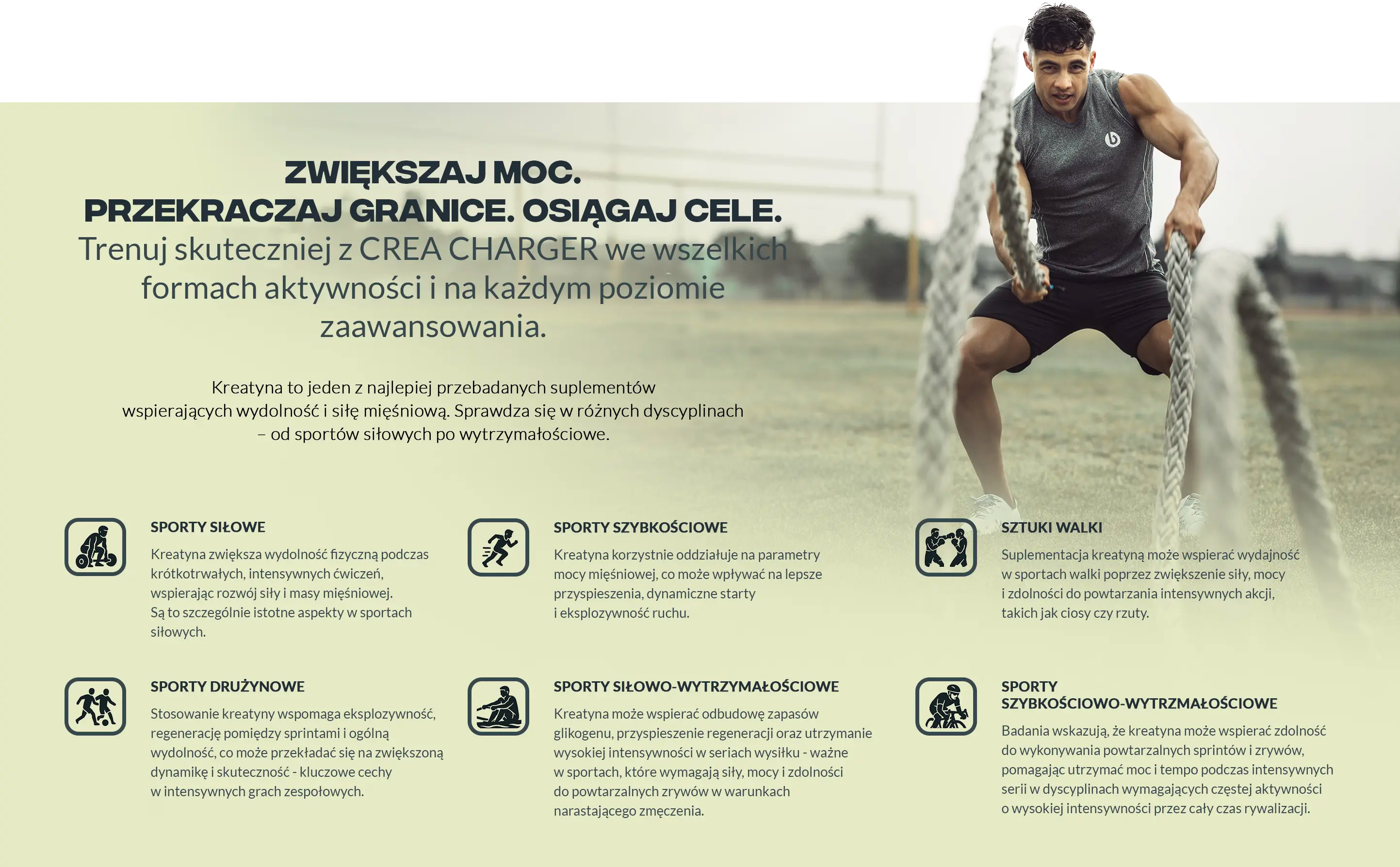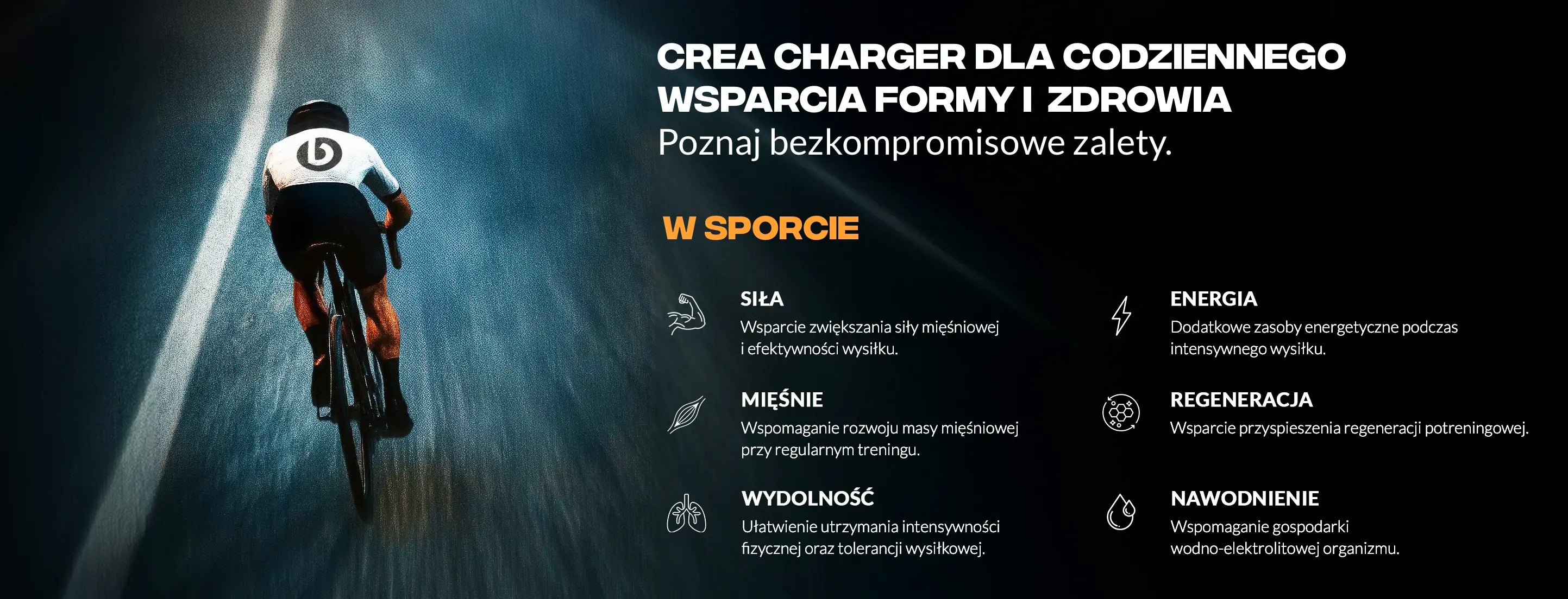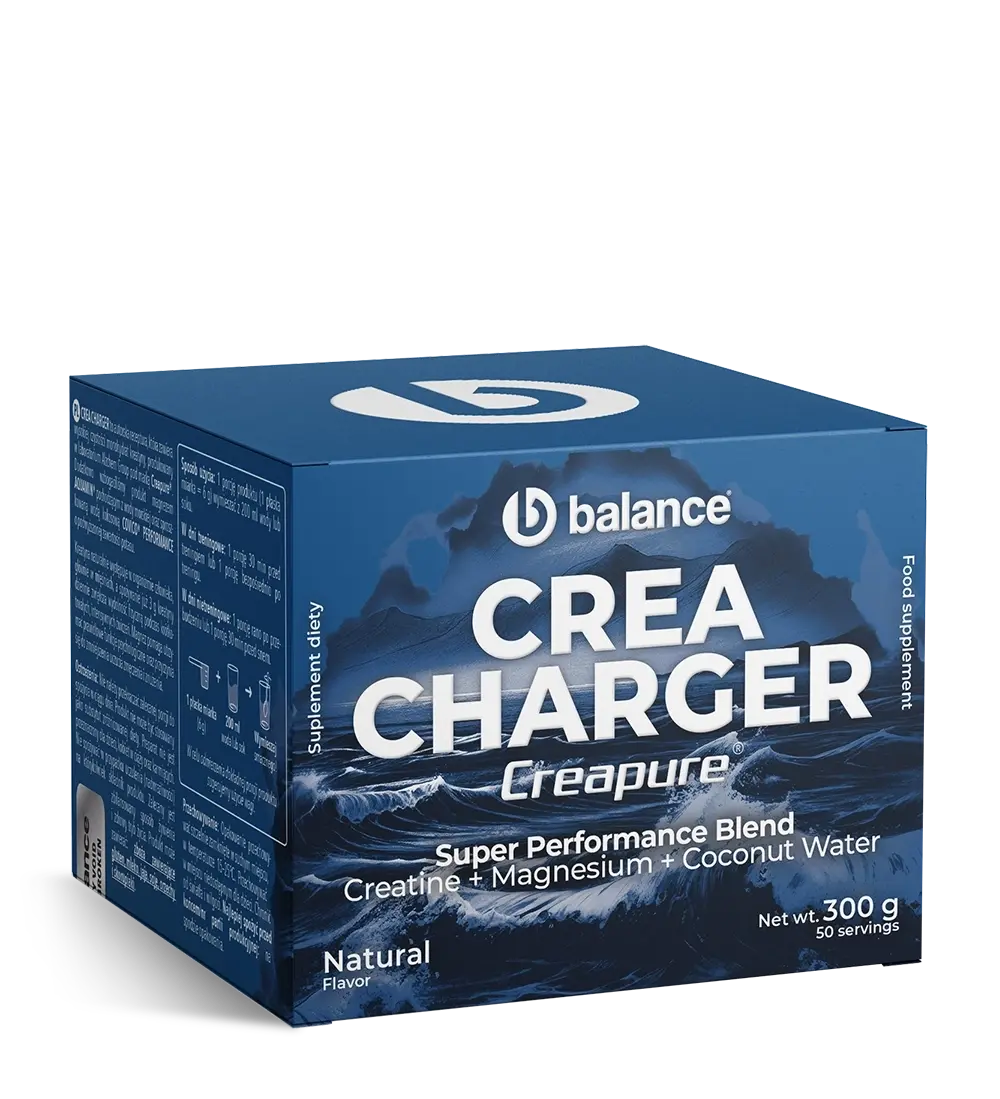 CREA CHARGER to autorska receptura, która zawiera wysokiej czystości monohydrat kreatyny, produkowany w laboratorium Alzchem Group pod marka Creapure®. Dodatkowo wzbogaciliśmy produkt magnezem AQUAMIN® pochodzącym z wody morskiej oraz sproszkowaną wodą kokosową COVICO® PERFORMANCE o podwyższonej zawartości potasu.