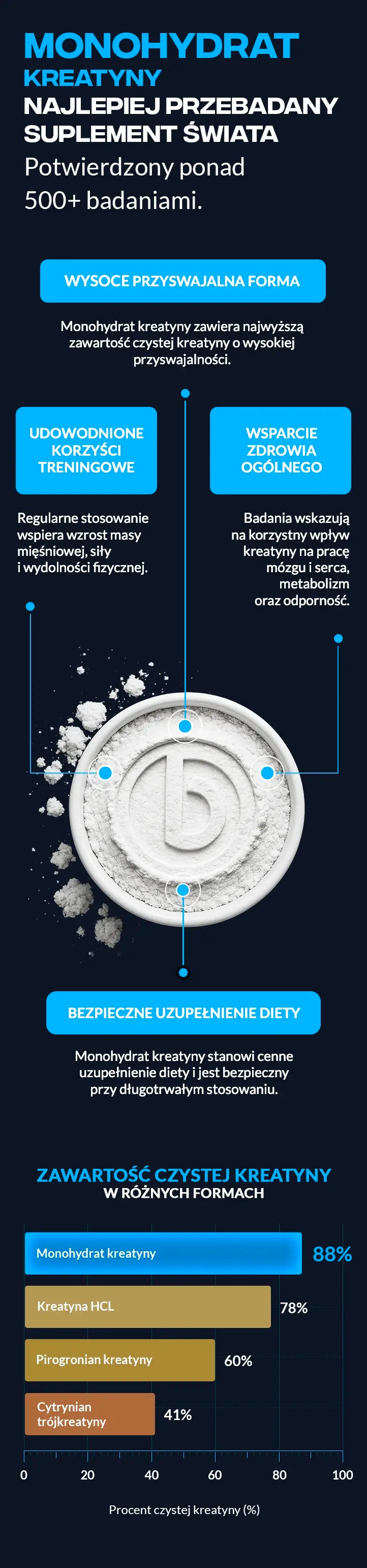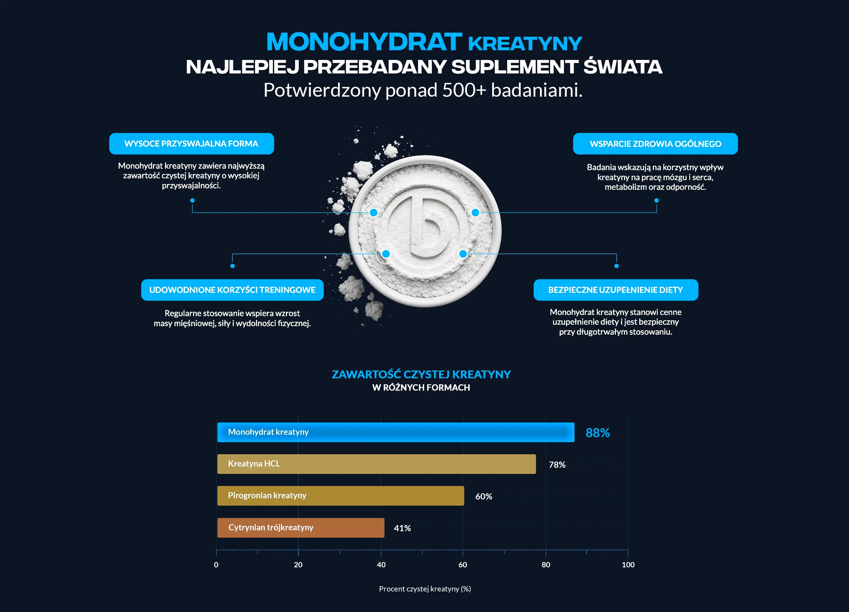 1 - Kreatyna (monohydrat kreatyny Creapure®) zwiększa ilość fosfokreatyny w mięśniach, co prowadzi do szybszej resyntezy energii komórkowej w postaci ATP oraz bardziej efektywnego treningu, sprzyjając tym samym wzrostowi masy i siły mięśniowej; kreatyna w połączeniu z treningiem może przyczyniać się do zwiększonego wytwarzania przez organizm czynnika wzrostu IGF-1, wspierającego przyrost tkanki mięśniowej