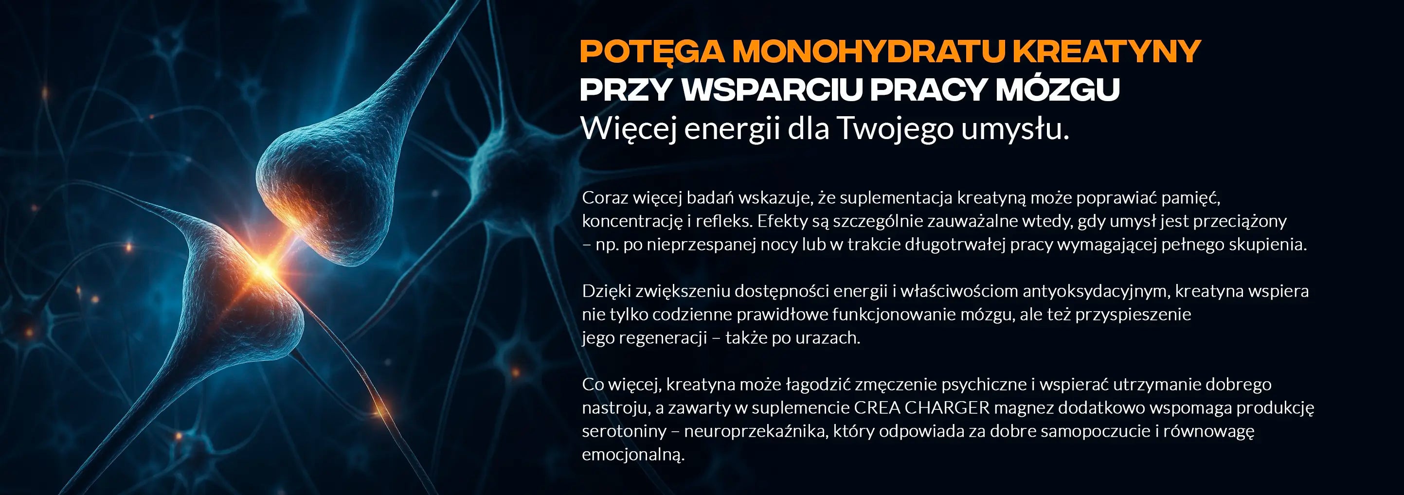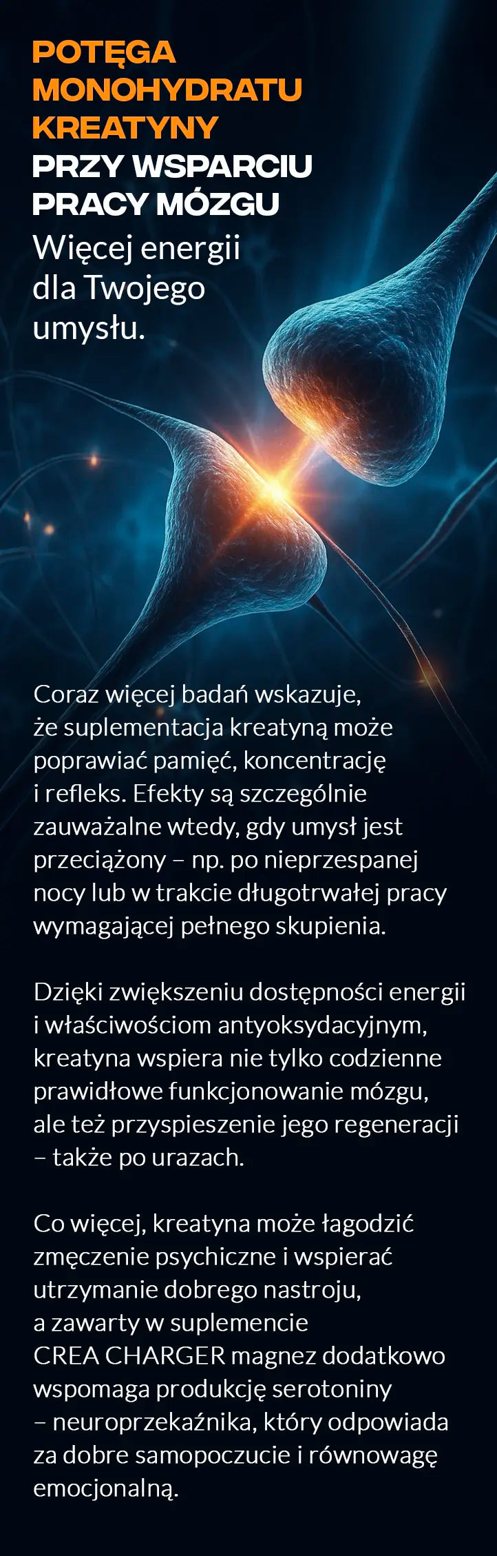 4 - Kreatyna (Creapure®) wspiera energetykę komórek nerwowych poprzez zwiększenie dostępności ATP w mózgu, co może poprawiać funkcje poznawcze – szczególnie w warunkach zmęczenia, stresu lub braku snu. Magnez (Aquamin® Mg) dodatkowo reguluje przewodnictwo nerwowe i stabilizację błon neuronów, wspierając prawidłową pracę układu nerwowego.