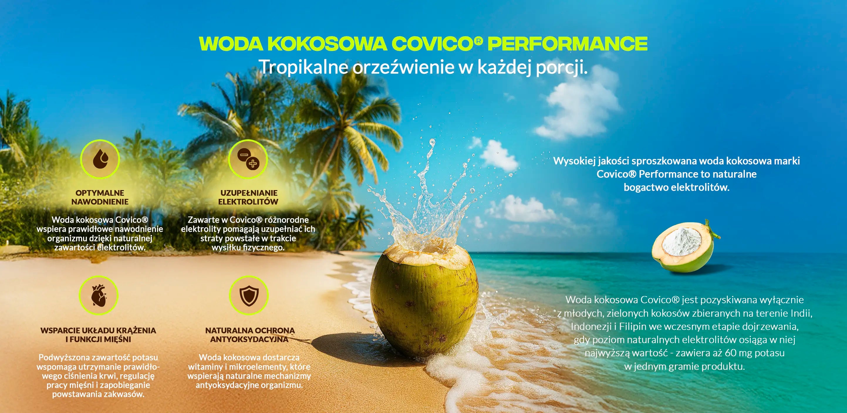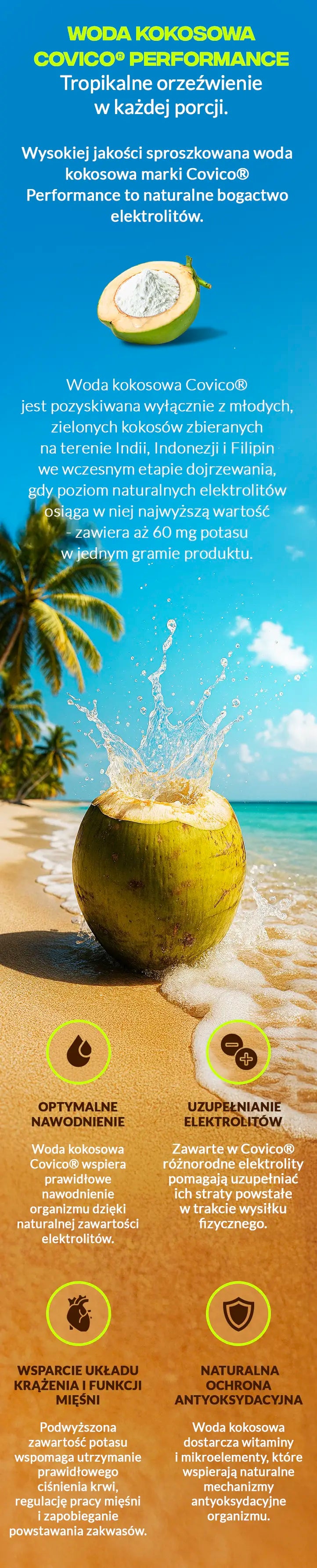 6 – Woda kokosowa (Covico®) o zwiększonej zawartości potasu oraz magnez (Aquamin®Mg) wspomagają utrzymanie prawidłowego nawodnienia organizmu oraz uzupełniają niezbędne elektrolity utracone podczas wysiłku fizycznego.