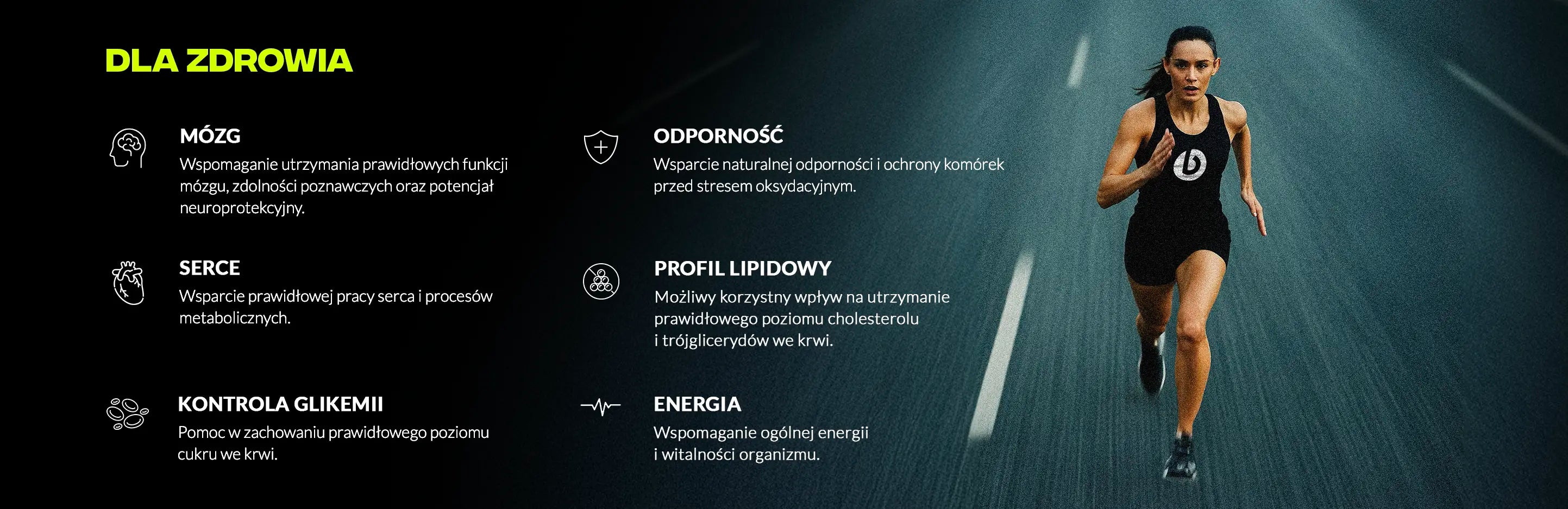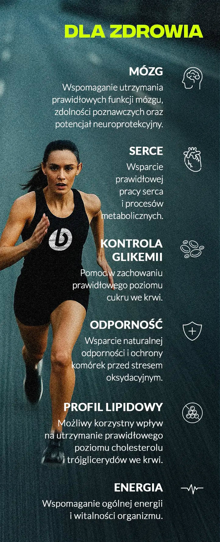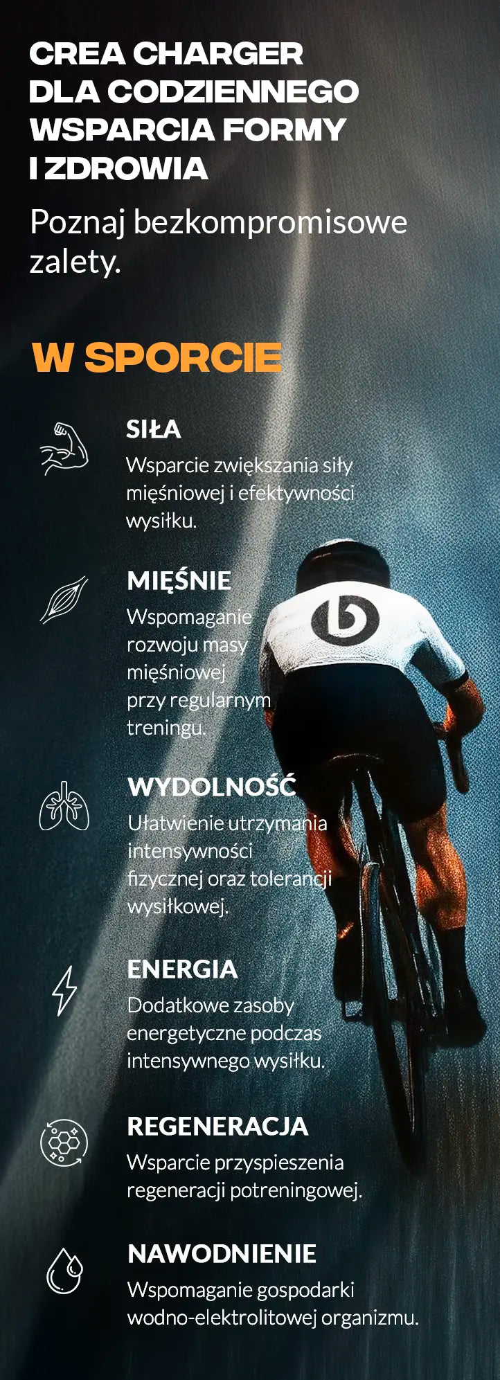 Spożywanie już 3 g kreatyny dziennie zwiększa wydolność fizyczną podczas krótkotrwałych, intensywnych ćwiczeń. Magnez przyczynia się do prawidłowego metabolizmu energetycznego, zmniejszenia uczucia zmęczenia i znużenia oraz pomaga utrzymać prawidłowe funkcje psychologiczne. Sproszkowana woda kokosowa stanowi cenne uzupełnienie elektrolitów w organizmie.