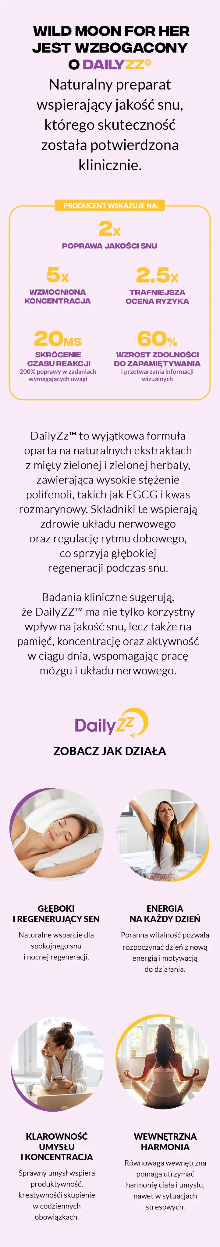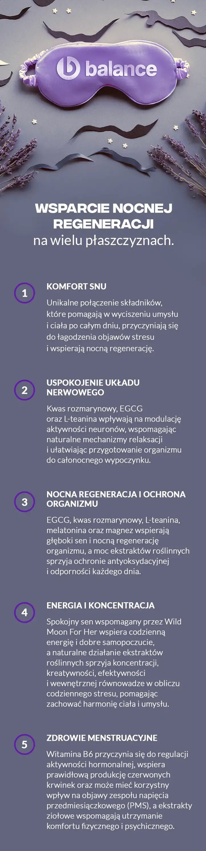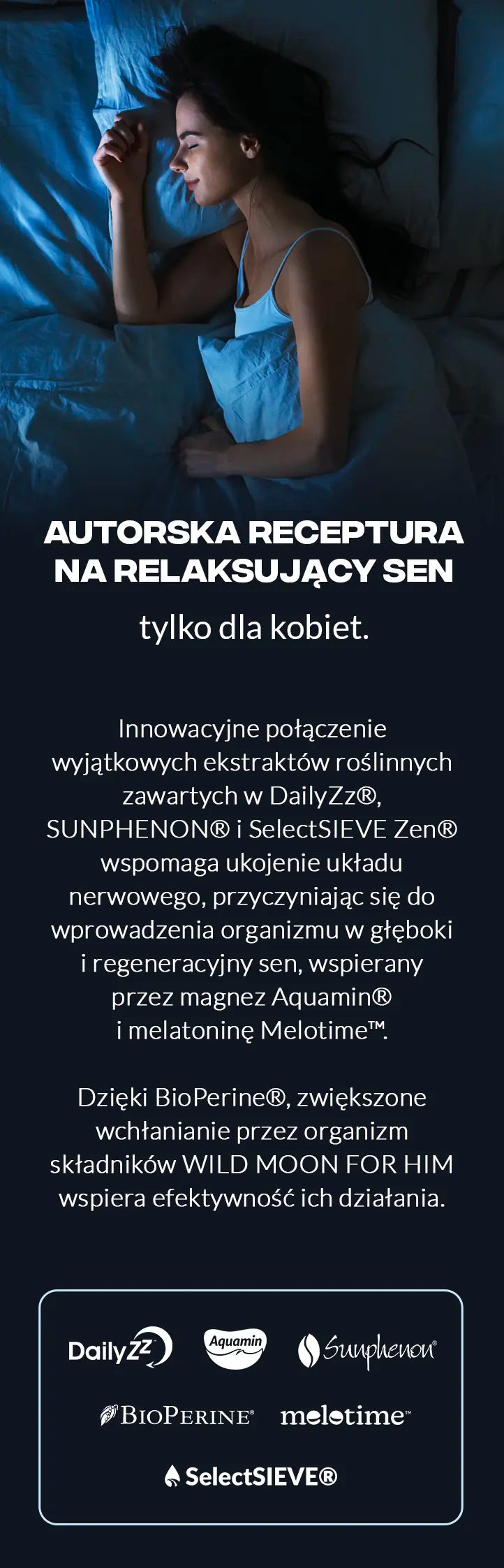 Innowacyjny produkt zawierający unikalne połączenie wysokiej jakości składników, które są kluczowe dla ukojenia nerwów, wyciszenia, wprowadzenia w stan relaksu i głębokiego, regenerującego umysł i ciało snu oraz przywrócenia sił witalnych na każdy kolejny dzień. W trosce o jak najlepsze samopoczucie kobiet, wyjątkowa receptura wspiera komfort i równowagę organizmu w trakcie cyklu menstruacyjnego.