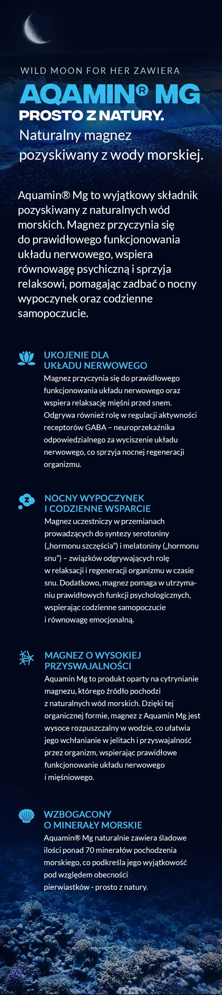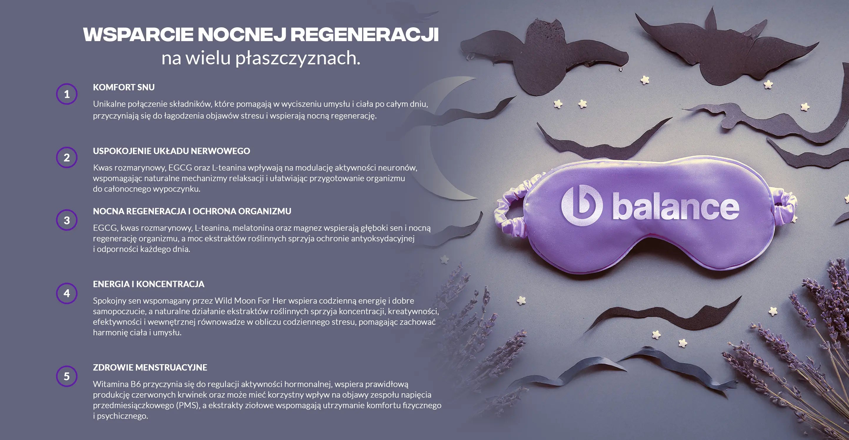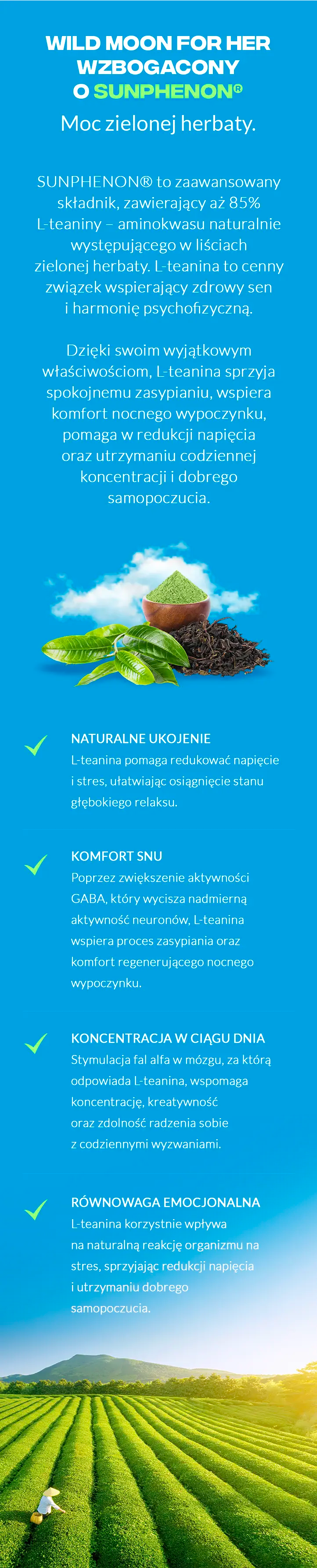 Innowacyjny produkt zawierający unikalne połączenie wysokiej jakości składników, które są kluczowe dla ukojenia nerwów, wyciszenia, wprowadzenia w stan relaksu i głębokiego, regenerującego umysł i ciało snu oraz przywrócenia sił witalnych na każdy kolejny dzień. W trosce o jak najlepsze samopoczucie kobiet, wyjątkowa receptura wspiera komfort i równowagę organizmu w trakcie cyklu menstruacyjnego.