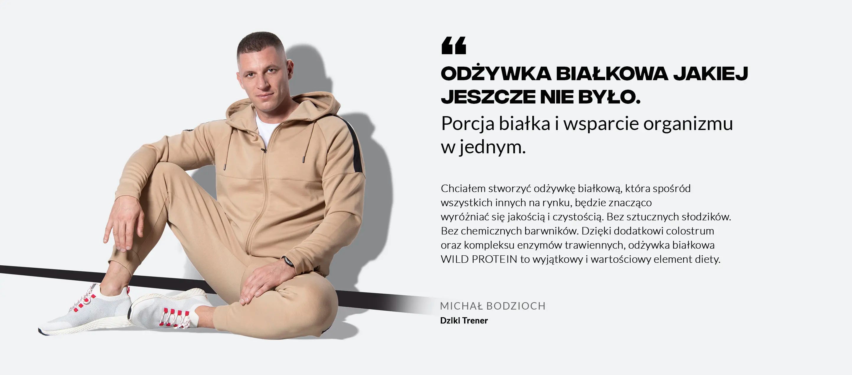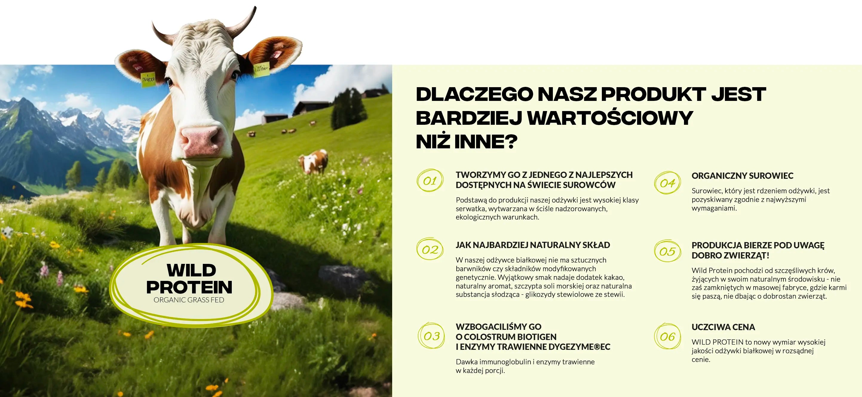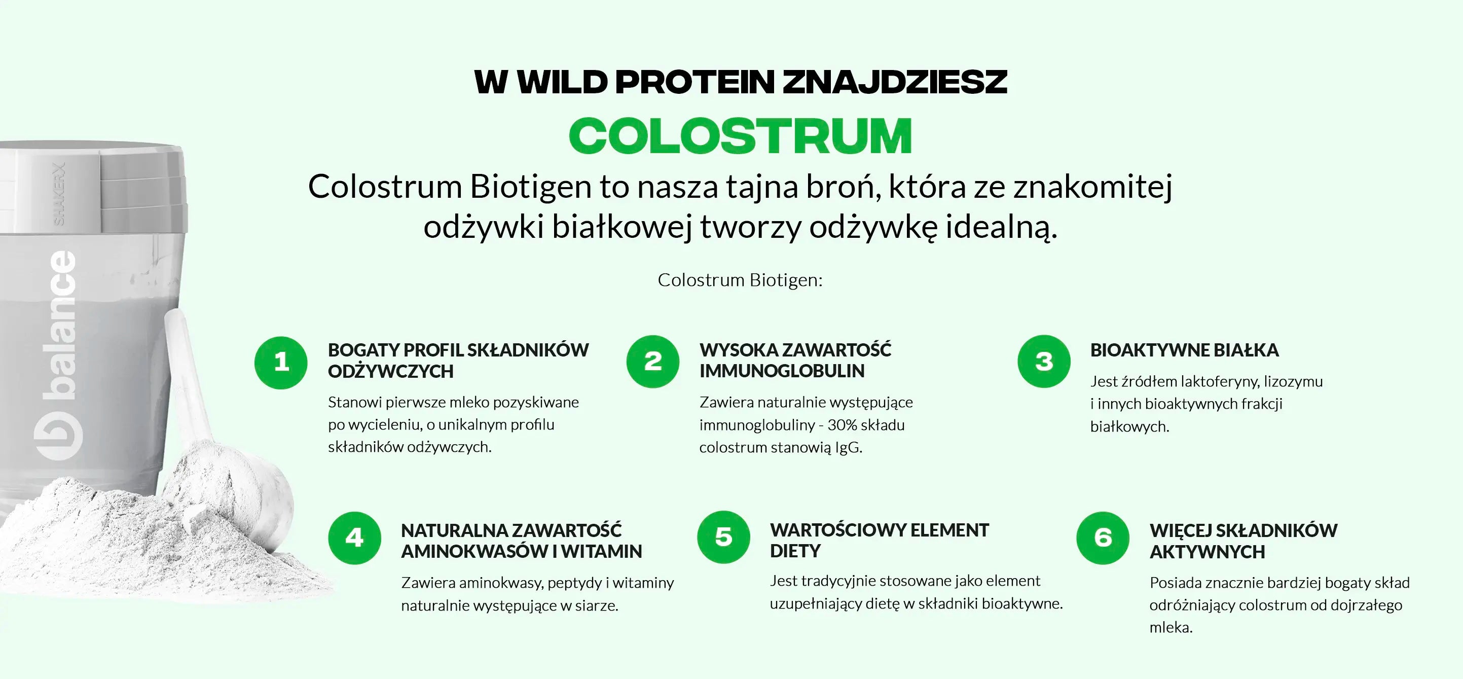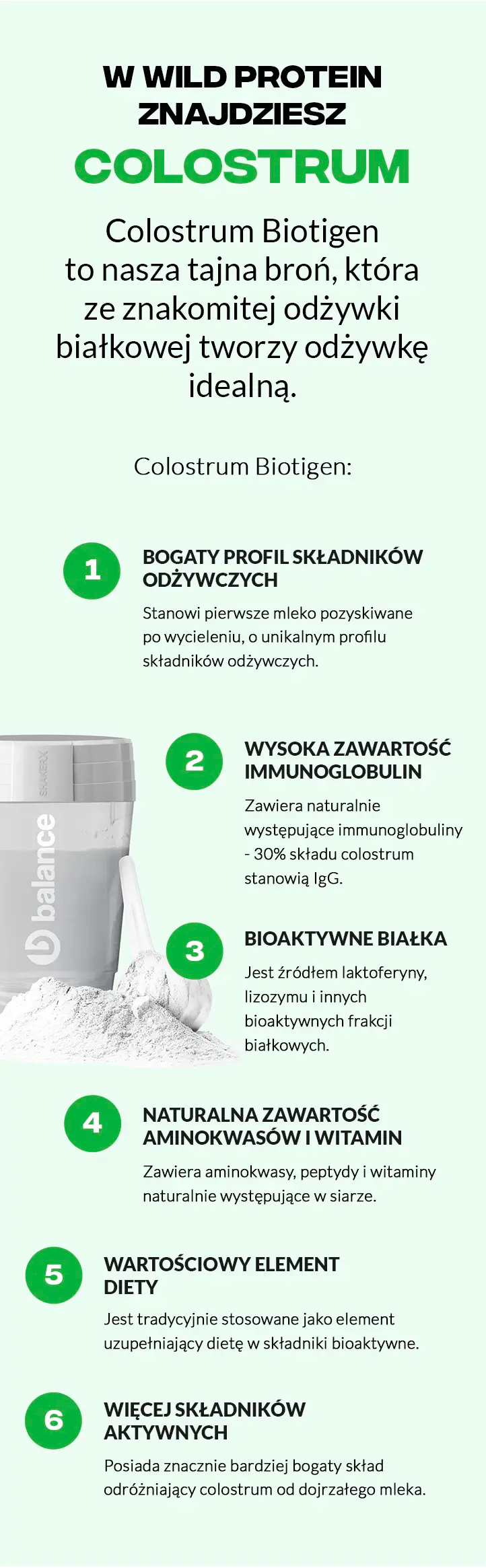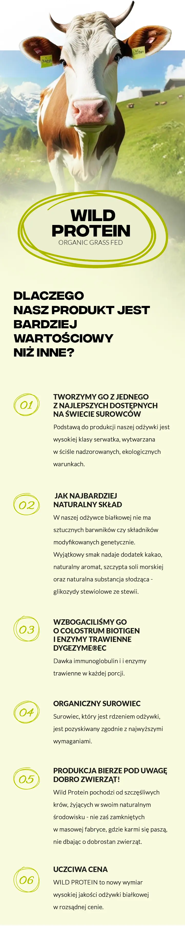 Wild Protein został wzbogacony o colostrum, będące naturalnym źródłem bioaktywnych peptydów i białek, w tym immunoglobulin IgG. Zawiera także enzymy trawienne, które odpowiadają za rozkład białek, węglowodanów, tłuszczów i celulozy, a podwyższona zawartość laktazy pomaga w trawieniu laktozy u osób mających trudności z jej trawieniem. Produkt nie zawiera dodatku cukru, syntetycznych barwników ani żadnych składników modyfikowanych genetycznie.