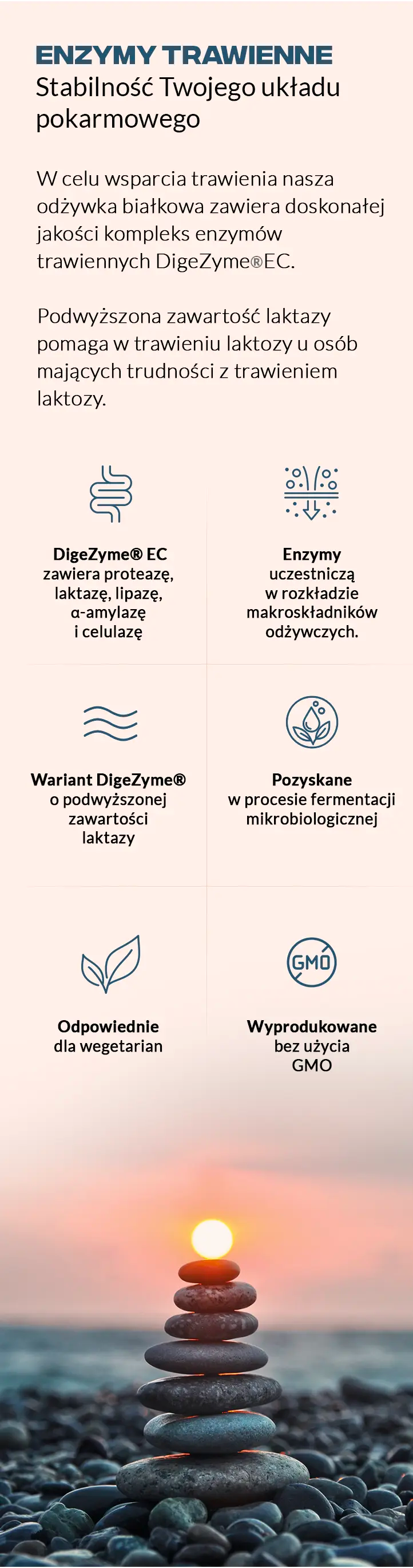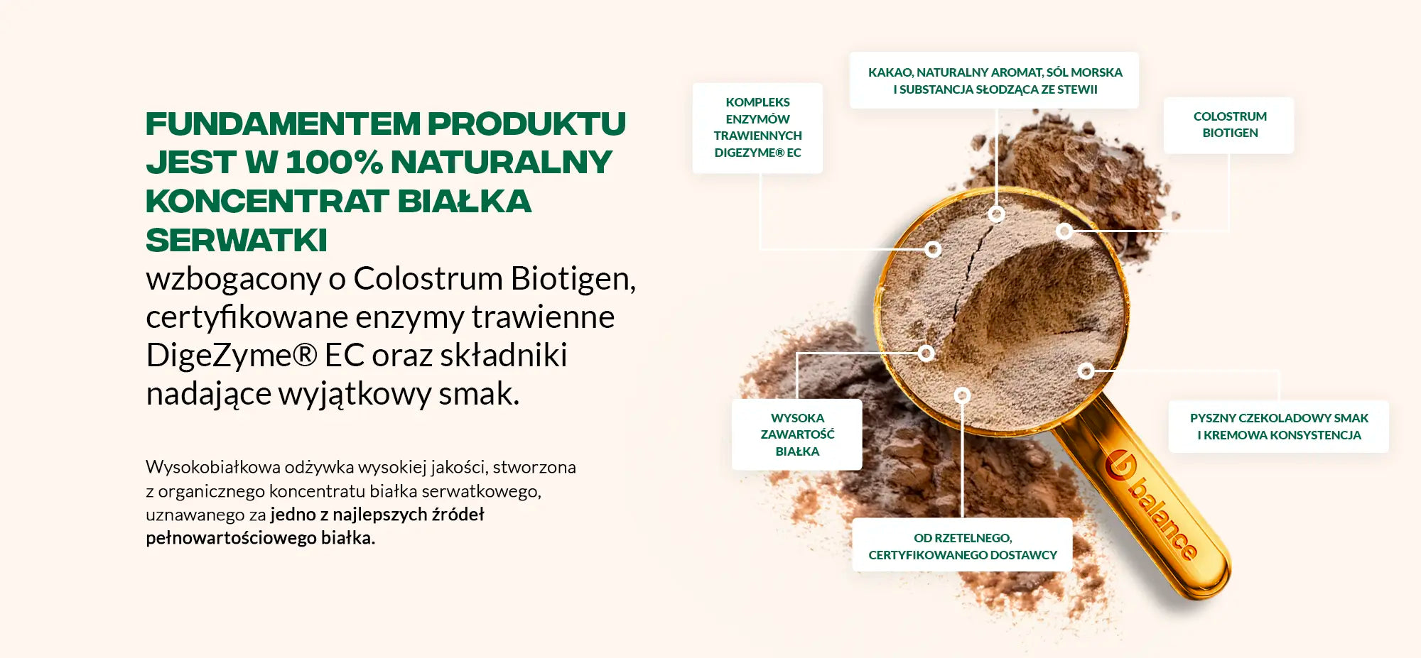 Koncentrat białka serwatkowego* (z mleka), kakao odtłuszczone, aromat naturalny, colostrum (skoncentrowana i odtłuszczona siara bydlęca) (z mleka), sól morska, kompleks enzymów – DigeZyme® EC [alfa-amylaza (z Aspergillus oryzae), neutralna proteaza (z Bacillus subtilis), laktaza (z Aspergillus oryzae), lipaza (z Rhizopus oryzae), celulaza (z Trichoderma longibrachiatum)], substancja słodząca - glikozydy stewiolowe ze stewii.