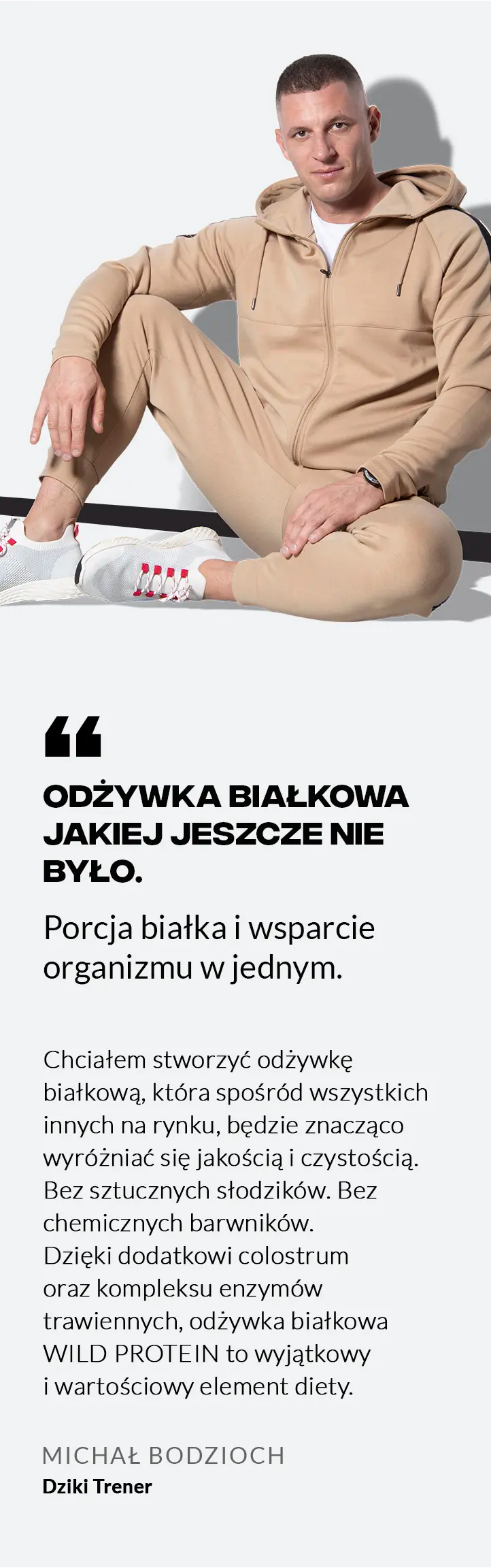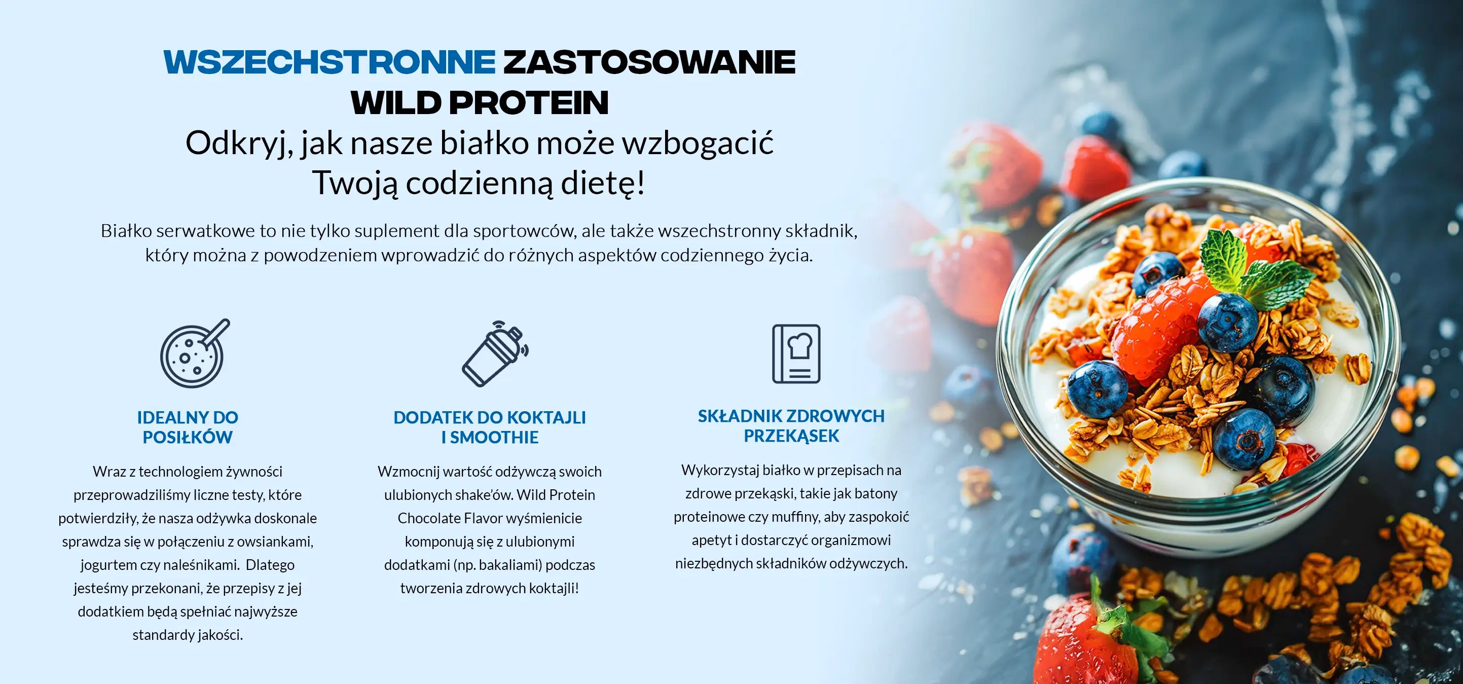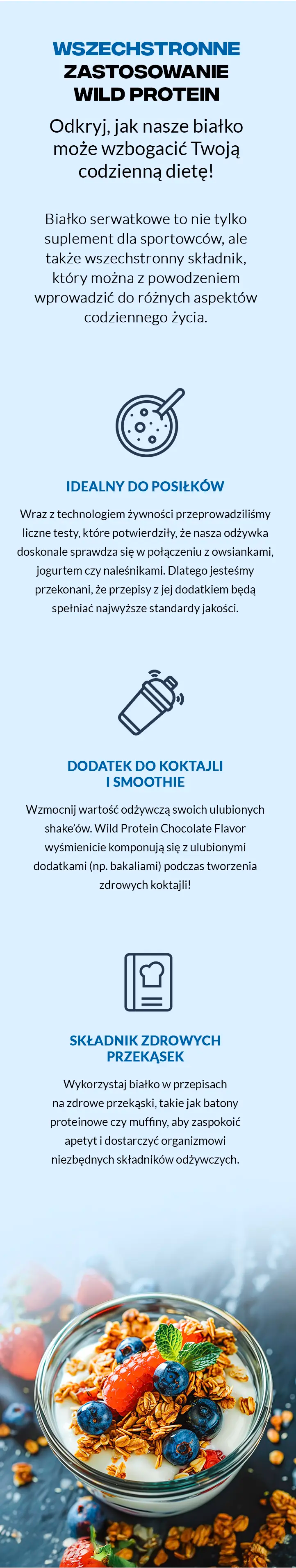 Wild Protein jest idealnym dodatkiem do shake'ów, owsianek, wypieków oraz fit deserów, co czyni go doskonałym wyborem dla osób prowadzących aktywny tryb życia oraz sportowców, których zapotrzebowanie na białko jest zwiększone. Białko odgrywa kluczową rolę w utrzymaniu i wzroście masy mięśniowej, a także w zdrowiu kości.