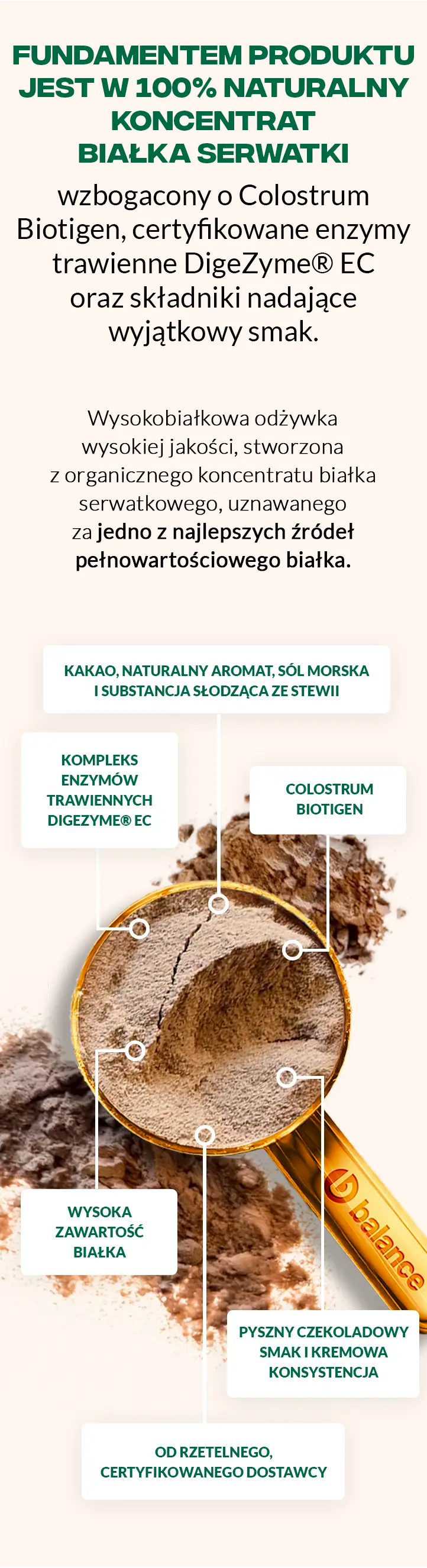 Organiczny koncentrat białka serwatki o pysznym czekoladowym smaku i kremowej konsystencji, z dodatkiem kakao, naturalnym aromatem, szczyptą soli morskiej oraz naturalną substancją słodzącą